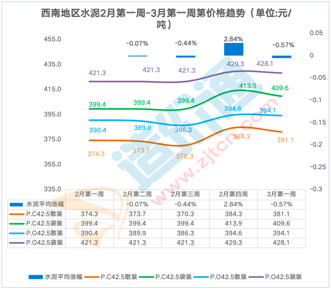 制价通每周调研华南地域各供应商获得如下价钱走势,2月第一殷勤2月第二周跌幅最大,P.C42.5袋拆:本周西南地域昆明、贵阳、沉庆水泥 P.C42.5 袋拆价钱呈涨跌互现态势,